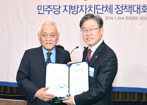 이재명 성남시장이 지난 24일 국회 본청 제4회의장에서 열린 ‘민주당 지방자치단체 정책대회 및 워크숍’에서 중산층과 서민을 위한 민생복지를 실현한 공로로 김한길 대표에게서 감사장을 받았다.