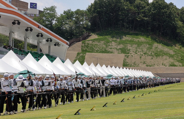 글자크기 설정 가 가 기사의 본문 내용은 이 글자크기로 변경됩니다. 25일 광주국제양궁장에서 열린 제43회 대통령기 전국 남녀 양궁대회 리커브 여자 고등부·일반부 70m 경기에서 선수들이 활시위를 당기고 있다. /연합뉴스