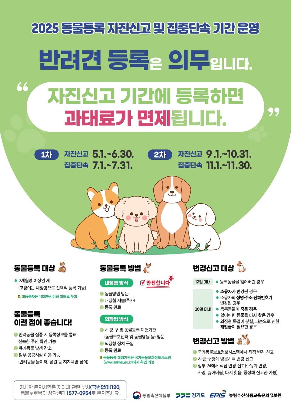 군 관계자는 “반려동물 등록은 법적 의무일 뿐만 아니라 반려동물을 가족으로 받아들이는 첫걸음”이라며 “많은 반려인들이 자진신고 기간을 활용해 동물 등록에 적극 참여해 달라”고 당부했다.