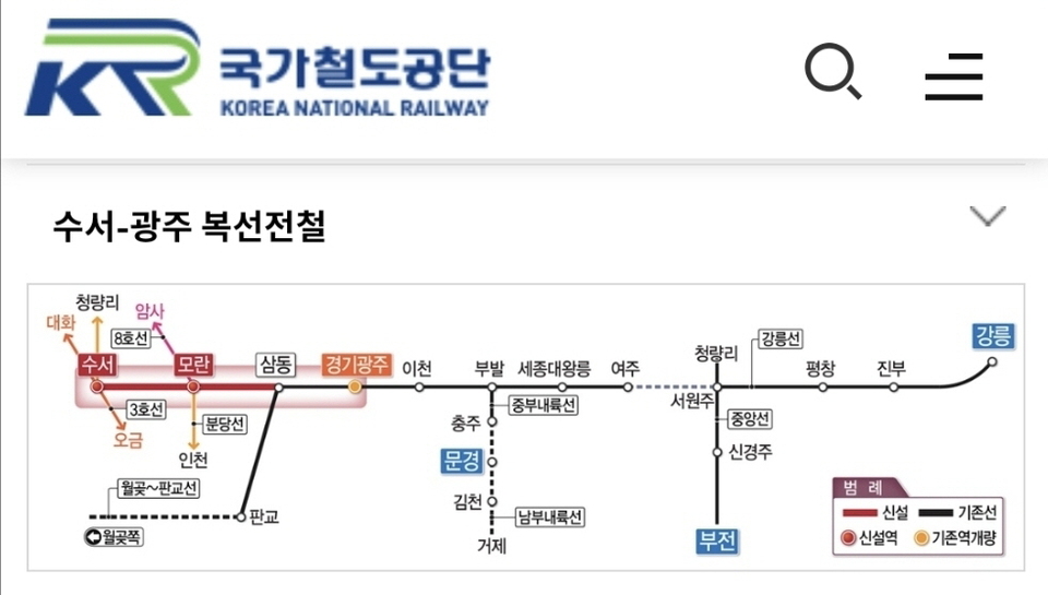 2030년 완공을 목표로 추진되는 수광선은 수서역에서 모란역을 거쳐 광주역까지 연장 19.4㎞ 구간으로 경강선(판교~여주), 중부내륙선(부발~충주) 등과 연계해 여주~서원주에 이어 남부내륙선과 강릉선까지 이어진다.