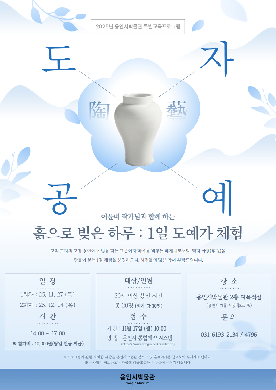 용인특례시는 오는 27일부터 12월 4일까지 용인시박물관에서 매주 목요일 오후 2~5시 두 차례에 걸쳐 ‘흙으로 빚은 하루 : 1일 도예가 체험’을 운영한다고 9일 밝혔다.