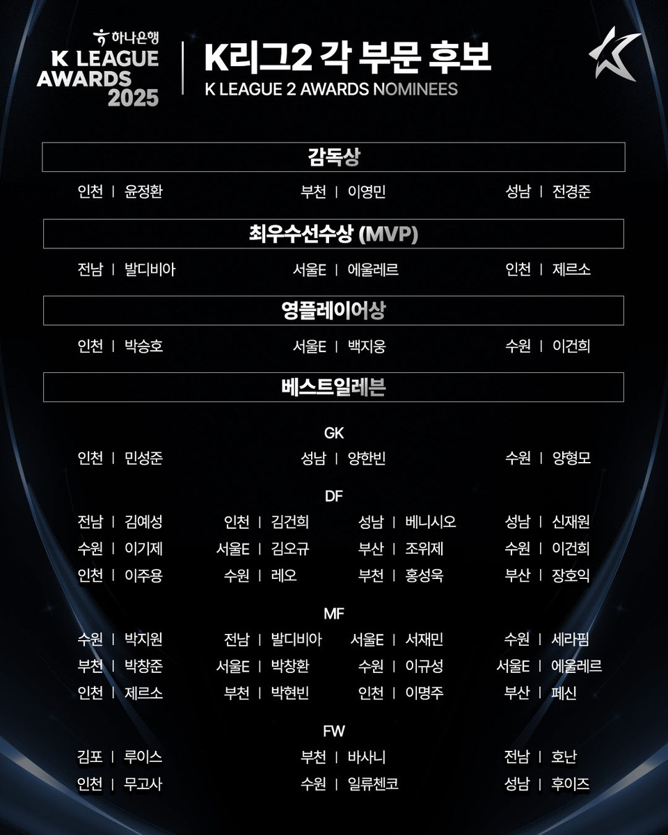 K리그2 베스트11 후보에는 공격수 부문에 일류첸코(수원), 후이즈(성남), 바사니(부천), 루이스(김포FC), 무고사(인천), 미드필더 부문에 박지원, 세라핌, 이규성(이상 수원), 박창준, 박현빈(이상 부천), 제르소, 이명주(이상 인천), 수부수 부문에 레오, 이건희, 이기제(이상 수원), 베니시오, 신재원(이상 성남), 김건희, 이주용(이상 인천)이 포함됐다.