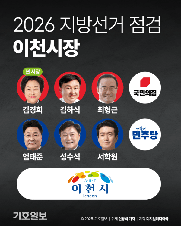 많이 본 뉴스 1 성남 “월판선에 판교원역 신설” 강력 촉구 2 정부 대출규제·갱신권 강화 여파… 송도 서민 전세대란에 ‘발동동’ 3 보수 텃밭서 맞붙는 ‘의정부고 동문’ 대전 4 안산시 혁신도시로 변신 중 5 인천 연수구 옹암체육센터 보수 과정서 하자 되레 늘어 ‘부실시공’ 불안감 팽배 6 [카드뉴스] 서민 울린 초고금리 지옥…불법 사금융 조직 61명 검거 7 경기도의회 운영위 행감 또 파행 해빙 무드 협치 다시 얼었다 8 [카드뉴스] 담배꽁초 한 개가 큰불로…매년 10억 재산 피해 9 [숏폼뉴스] 오산시장 선거, 이권재 수성 vs 민주당 탈환 ‘대격돌’ 전망 | 2026 지방선거 누가 뛰나 10 現 김경희 vs 前 엄태준 리턴매치 성사될까
