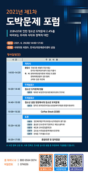 센터가 발간한 ‘2020년 청소년 도박문제 실태조사’에 따르면, 우리나라 재학 중 청소년의 2.4%가 도박문제를 겪는 것으로 나타났다. 이는 청소년 6만 6천 여 명에 해당하는 수치다. 센터는 비대면 사회 속 청소년의 인터넷 및 스마트기기 사용이 늘어남에 따라 청소년 도박문제 실태와 예방정책 공론화를 위해 이번 포럼을 마련했다.