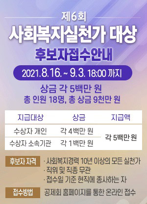 시상식은 코로나 상황을 고려해 온라인 시상식으로 진행할 예정이며 오는 12월 9일부터 한국사회복지공제회 유튜브를 통해 시청할 수 있다. 자세한 내용은 한국사회복지공제회 홈페이지 공지사항에서 확인 가능하며 접수는 홈페이지를 통해 가능하다.